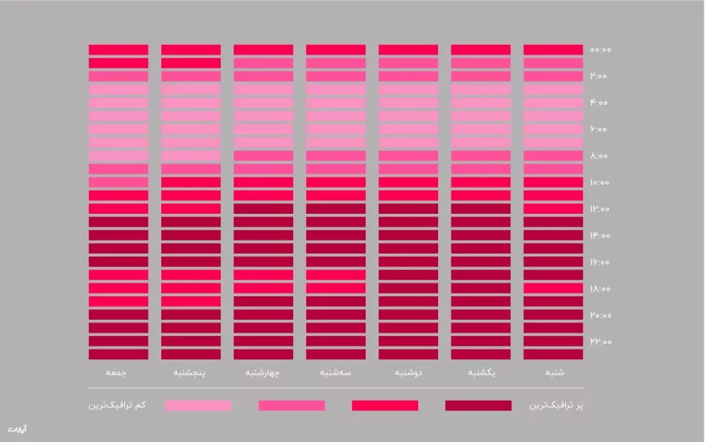 آپارات هم مانند هر سرویس دیگری روزها و ساعتهای خاصی دارد که در آن ترافیک زیاد یا کم است. براساس گزارش آپارات که در تصویر زیر هم قابل مشاهده است، ترافیک در این سرویس در روزهای مختلف هفته از ساعت تقریبا ازر۱۲ ظهر شروع میشود و در بین ساعتهای ۱۴ تا ۱۸ پرترافیکترین ساعتها را تجربه میکند و مجددا از ساعت ۱۸ تا ۲۲و ۱۲ نیمهشب ترافیک بیشتری را مدیریت میکند. کم ترافیکترین ساعتها در آپارات ساعتهای ۲،۴، و ۶ صبح است.