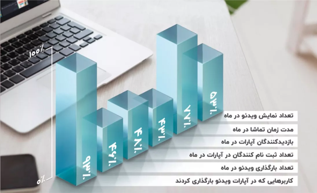 آپارات در گزارش عملکرد یکساله خود به آمارهای جالبی هم اشاره کرده است. یکی از این نمونهها این است که در تیر ۱۳۹۹ تا تیر ۱۴۰۰، بیش از ۱۸میلیارد بار از ویدئوهای آپارات بازدید شده است که این عدد در مقایسه با مدت مشابه سال قبل، رشد ۵۳ را نشان میدهد. به نظر میرسد شاید یکی از عوامل رشد این میزان بازدید به شیوع کرونا، در نظر گرفتن زمان قرنطینه یا دورکاری بسیاری از کسبوکارها بیارتباط نباشد.